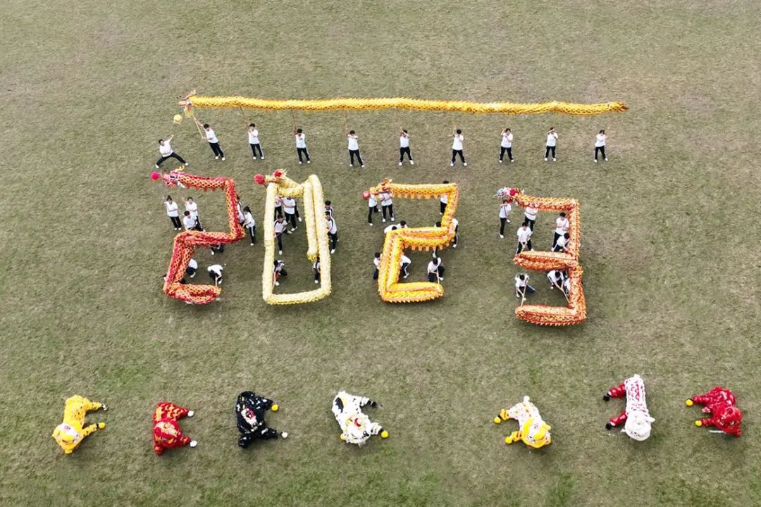 舞龙队队员与舞狮队队员们