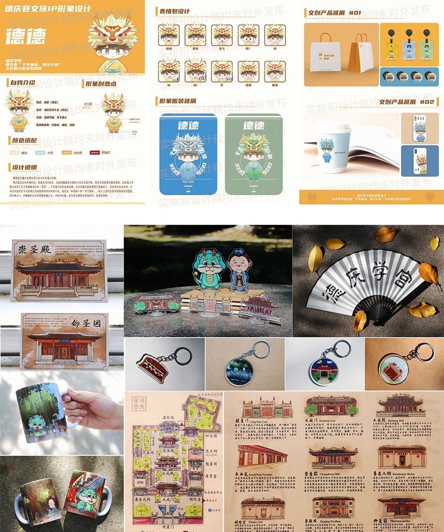 今年,实践团成员聚焦德庆当地丰富的旅游资源,针对所发现的痛点、难点问题,结合德庆旅游特色及本土特色文化内涵,打造“德庆人文IP”品牌,设计“趣”游德庆系列文创产品16类,包含IP形象、旅游Logo、地图等,通过社会实践活动探寻文旅融合发展的新模式和新思路,进一步推动文旅产业的协调发展和优化升级,探索将传统艺术与现代设计相结合的方式,提升文化和经济的融合发展,促进文化创意产业的转型升级,推动德庆县文化产业的高质量发展。