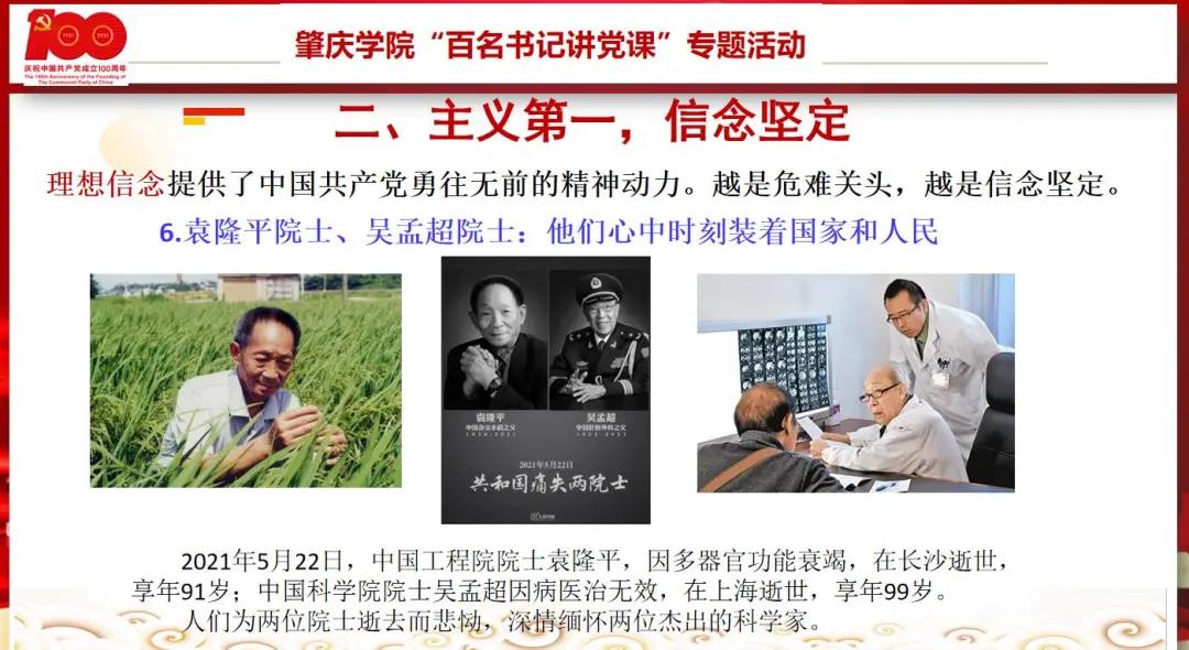 党课中,黄劲松把政治理论与生动史实相结合,列举红船精神、井冈山精神、长征精神、焦裕禄精神、铁人精神、雷锋精神、抗疫精神、脱贫攻坚精神中的典型事例,表明这些精神其中所蕴含的共产主义价值内核就是我们党从初创到现在始终坚守的精神根脉。他强调同学们要从党的百年奋斗历程中汲取继续前进的智慧和力量,继承和学习那些富有生命力的仍然行之有效的伟大精神、宝贵经验。他希望同学们能够学史知史、知史爱党、知史爱国,为实现中华民族伟大复兴的中国梦贡献青春力量、谱写青春华章、绽放青春光彩,以优异成绩向建党100周年献礼!