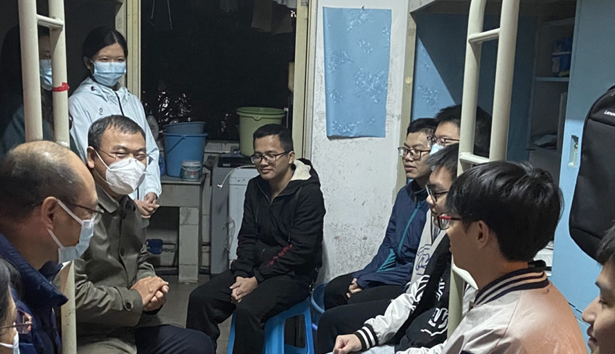 本网讯 12月1日晚,副校长李新昌在数学与统计学院党委书记杨帆和副书记高洁云的陪同下,走访慰问厚德书院1栋男生宿舍,了解疫情当下,学生的生活、学习以及思想情况。