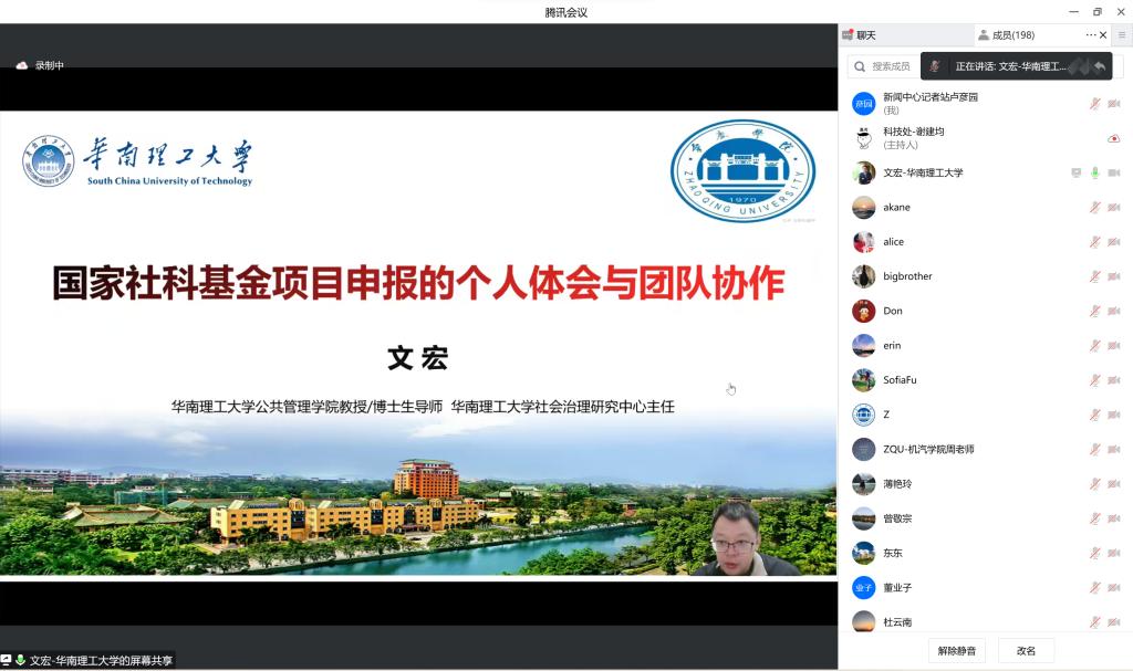 本网讯 12月1日,外围平台召开2023年自然科学、社会科学高层次科研项目申报辅导报告会(线上),来自广东省科学院生态环境与土壤研究所研究员刘承帅、华南理工大学公共管理学院教授、博士生导师文宏分别受邀作自然科学、社会科学科研项目申报专题辅导报告,副校长胡文涛出席并作讲话,科技处、社科处主持工作副处长徐士河主持会议。