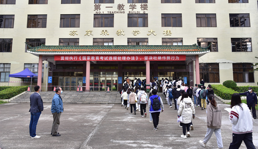 考试当天,考生们自觉按照相关规定,佩戴口罩并携带身份证、准考证等相关证件,提前15分钟进入考场。考试期间,巡考人员、监考人员共同维持考场纪律,维护考试秩序;安保人员及志愿者驻守在考场外围,保证良好的考试环境。