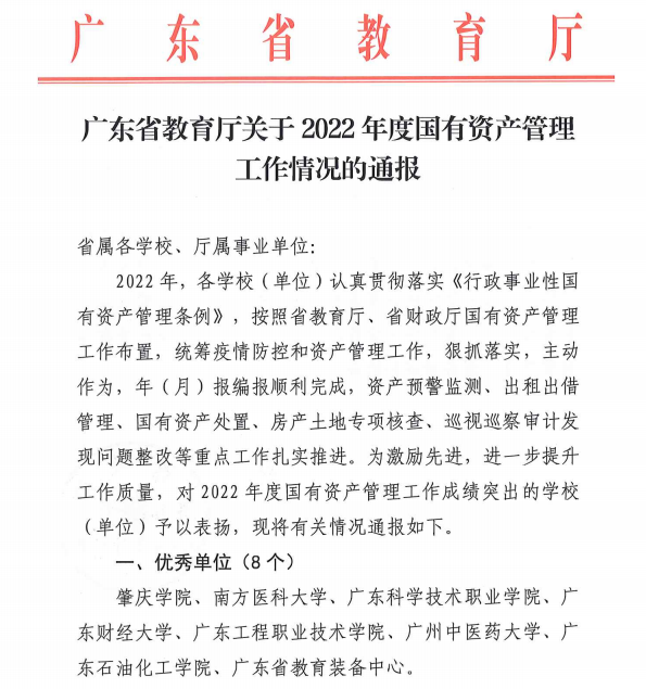 本网讯 日前,广东省教育厅发布了《广东省教育厅关于2022年度国有资产管理工作情况的通报》,文件依据2022年度年(月)编报情况、资产预警监测、出租出借管理、国有资产处置、房产土地核查专项检查、巡视巡察整改等情况,对全省20个单位进行通报表扬,其中外围平台获评高校国有资产管理工作“优秀单位”称号,成为全省8个获得该殊荣的高校。