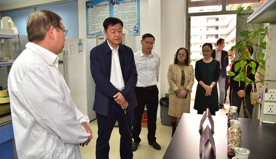 李旭东一行首先参观了果树研究所,听取负责人吉前华关于打造柑橘产业协同创新中心,推进优良果树品种引育、先进果树栽培技术推广应用、黄龙病防治技术研发等最新工作成果的介绍。接着,又来到大学科技园,走访园区的科技和文创两大基地,听取负责人陈学年关于园区促进农业科技成果转化、现代农业企业提升和新型农科人才培养等方面的介绍;在南药研究与开发中心,李旭东一行通过听取负责人刘文华的介绍,深入了解中心与企业和药材基地加强合作,围绕巴戟天、何首乌、广佛手、肉桂等四大道地南药品种开展研究利用的情况;最后,李旭东一行来到环境健康与资源利用省重点实验室,听取负责人袁国栋的情况介绍,了解实验室在发挥肇庆优势、培育双碳产业,打造三产融合模式、助力乡村振兴,做好垃圾分类、擦亮特色名片等方面的工作成效。
